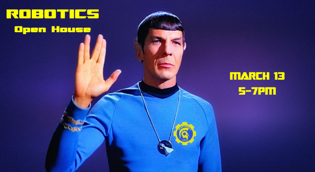 Mark Your Calendar for March 13, 5-7 PM Save the Date: On Wednesday, March 13, everyone is welcome to join us at our All Robotics Open House! You’ll have the opportunity to see robots from elementary school teams to high school teams, including Spartronics’ newest robot! We hope to see you there!